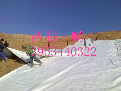 兩布一膜的施工細則: 在運輸過程中兩布一膜要避免受到物理的損壞。受嚴重磨損的兩布一膜不能在工程中使用。在工程現場,兩布一膜應該堆放于經平整不積水的地方,堆高不超過五卷的高度,并能看到卷的識別片。兩布一膜用不透明材料覆蓋以防紫外線老化。在儲存過程中,要保持標簽的完整和資料的完整。在施工現場,基面一定在按設計要求清理好,這是確保防滲效果的關鍵,特別是對尖石、樹根等雜物要徹底清除干凈,基面不允許有局部凹凸現象,清理好的基面要用夯錘或夯板夯緊,使之密實平整。靠兩布一膜10cm厚的保護層土料一定要過篩,不允許有粒徑大于6mm以上顆粒,否則易刺破兩布一膜。鋪設兩布一膜時,一定要由上而上的鋪設。膜與膜之間及膜與基面之間要壓平貼緊,但不宜將膜拉得過緊,一般要略松一點,但不能在膜底留有氣泡。因為兩布一膜比較薄且很輕,鋪好以后,在未鋪好保護層以前,極易被風吹動,所以一次鋪膜面積不宜過大,邊鋪膜邊蓋保護層土料。回填保護層及砌筑塊石護面時,一定要輕放,以免撞破兩布一膜。兩布一膜的接縫接頭有熱粘、膠粘、搭接等方法,兩布一膜鋪設完成后,應盡量減少在膜面上行走、搬動工具等。